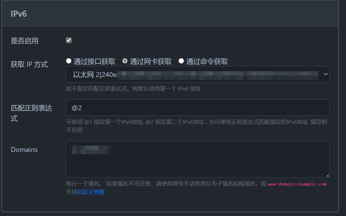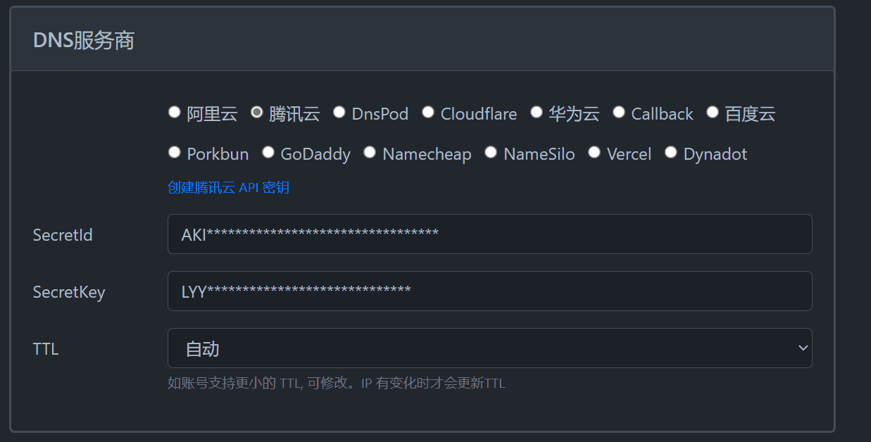 在后台选择自己的dns服务商,选择自己购买域名的厂商即可,填入id和令牌,设置好希望解析的ip和对应的域名保存即可